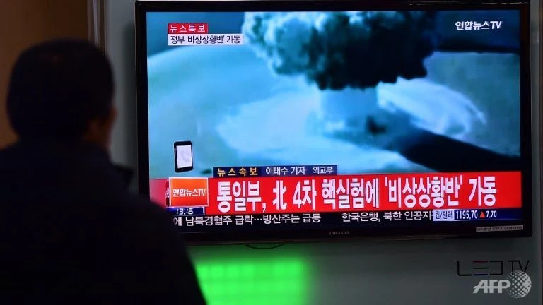 Kênh truyền hình Yonhap News đưa tin vụ Triều Tiên thử nghiệm thành công bom nhiệt hạch hôm 6-1. Ảnh: AFP