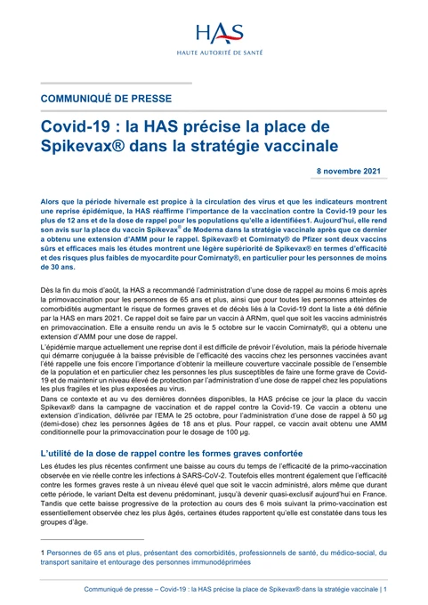 Bản khuyến cáo của Hội đồng Y tế cấp cao Pháp (HAS) hôm 9-11. Ảnh: HAS