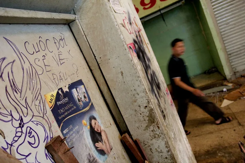 Những dòng chữ viết nguệch ngoạc trên cửa sạp đã được chuyển đi.