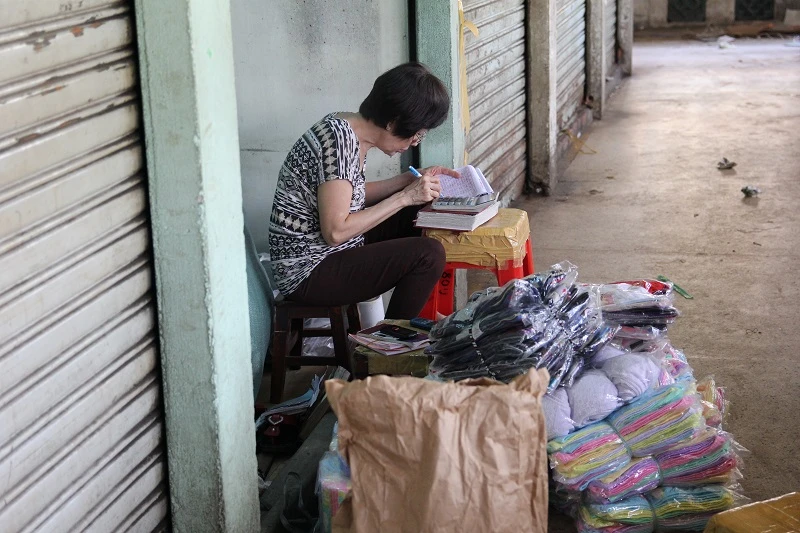 Một tiểu thương tính toán lại số hàng trước khi chuyển qua khu mới.