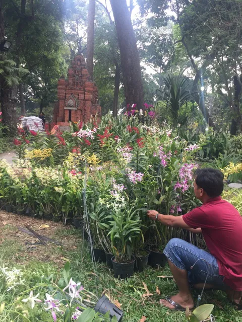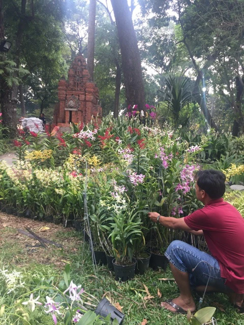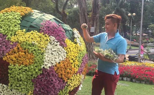 Tại Hội Hoa còn có các biểu tượng của các dân tộc trong cộng đồng dân tốc Việt. Trong ảnh, các nghệ nhân chăm sóc hoa trước hình tượng Tháp Chàm.