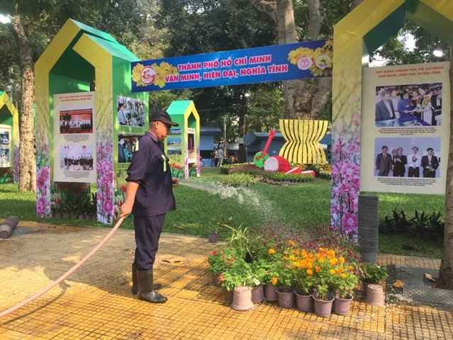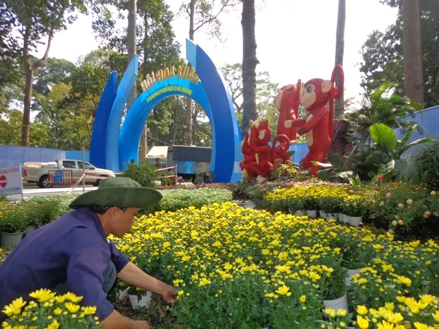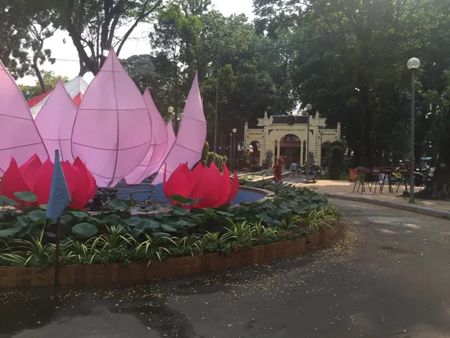 Đến chiều nay, cổng chào ở cửa chính phía đường Trương Định đã được dựng xong với đồi hoa phía trước đang được công nhân chăm tỉa.