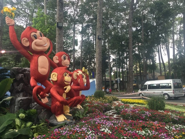 Tết Bính Thân này với linh vật là Khỉ nên gia đình khỉ gồm bố, mẹ và hai con sum vầy được dựng ngay trước cổng đón chào khách.