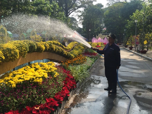 Bước qua cổng chính, khách gặp ngay hai dải hoa đủ màu uốn lượn như hai dải lụa màu đang bay trước gió. Trong ảnh, công nhân chăm tưới hai dải lụa hoa chiều 2-2.
