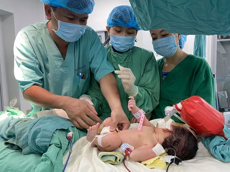 Sau sinh bệnh nhi có cân nặng 2,9 kg và được chuyển sang đơn vị Sơ sinh - Trung tâm nhi theo dõi. Lúc vào trung tâm, bệnh nhi có tím môi vừa, thở nhanh gắng sức nhẹ, nghe tim có tiếng thổi tâm thu. Bệnh nhi được cho thở ôxy, truyền dịch nuôi dưỡng, kiểm tra xét nghiệm máu, siêu âm tim...