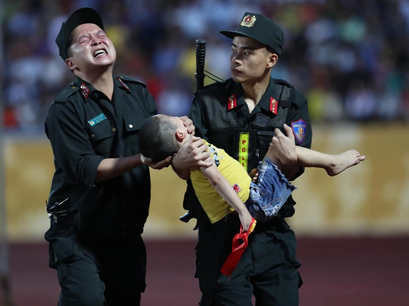 Hai chiến sĩ cảnh sát cơ động cứu em bé trong biển người sân Thiên Trường
