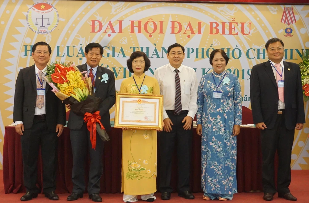 Ông Trần Thế Lưu, Trưởng ban Nội chính Thành ủy TP.HCM, thay mặt Chính phủ trao bằng khen cho Hội Luật gia TP.HCM. Ảnh: NGÂN NGA