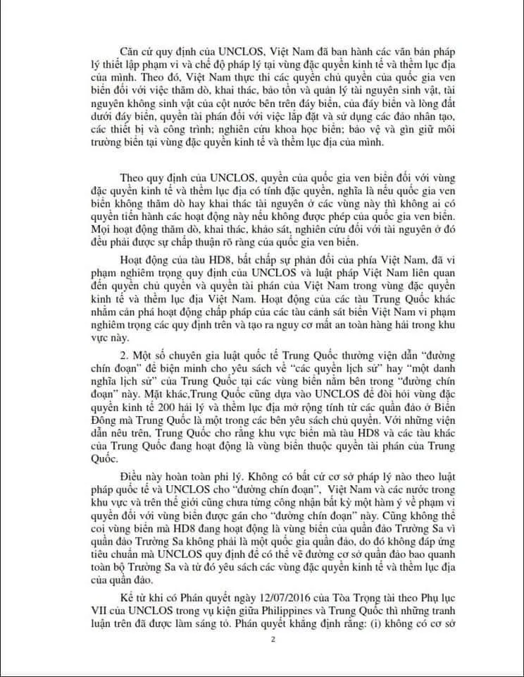 Thứ nhất, khu vực mà tàu khảo sát địa chấn HD8 đang hoạt động nằm hoàn toàn trong phạm vi vùng đặc quyền kinh tế và thềm lục địa của Việt Nam. Theo Công ước của Liên Hiệp Quốc về Luật Biển 1982 (UNCLOS), đây là khu vực không có tranh chấp hay chồng lấn giữa Việt Nam và Trung Quốc, mà nó thuộc chủ quyền của Việt Nam. Do vậy, bất kể Việt Nam có hay không việc thăm dò, khai thác tài nguyên ở các vùng nêu trên thì cũng không ai có quyền tiến hành các hoạt động tương tự.