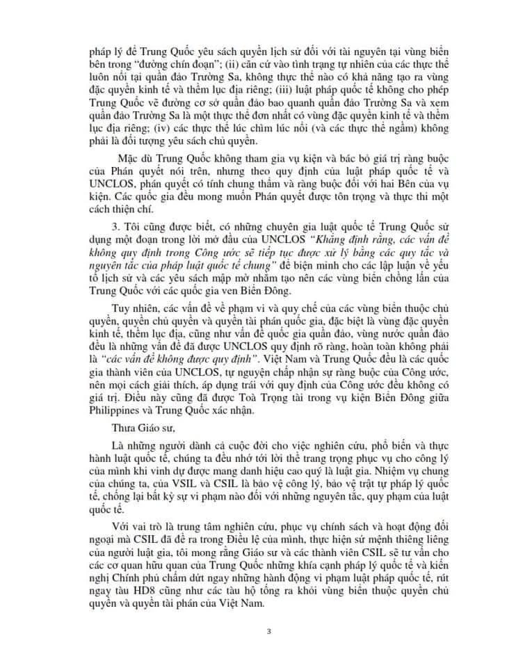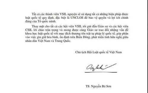 Cuối thư ngỏ, VSIL cho biết sẽ sử dụng tất cả những biện pháp được luật pháp quốc tế quy định, đặc biệt là UNCLOS để bảo vệ quyền và lợi ích chính đáng của Tổ quốc mình. Cạnh đó, VSIL mong muốn trao đổi cùng CSIL dưới góc độ khoa học luật quốc tế về các vấn đề biển đảo, góp phần vào việc ổn định tình hình biển Đông, phát triển tình hữu nghị giữa nhân dân Việt Nam và Trung Quốc.
