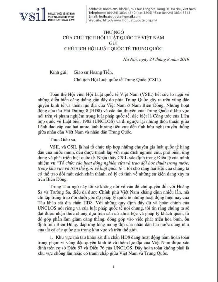 Trước hành động ngang ngược, bất chấp luật pháp quốc tế của Trung Quốc khi đưa tàu khảo sát địa chất Hải Dương 8 (HD8) và các tàu hộ tống xâm phạm nghiêm trọng chủ quyền biển đảo của Việt Nam, Hội Luật Quốc tế Việt Nam (VSIL) đã gửi thư ngỏ, bày tỏ quan ngại sâu sắc về vấn đề trên với Hội Luật Quốc tế Trung Quốc (CSIL).