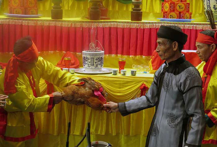 Sau khi đọc lời thề, những người tham gia buổi tế cắt tiết gà tế phẩm, hoà cùng bình rượu trắng dâng thần linh và chia cho chức sắc, hương thân, phụ lão trong làng để cùng nhau chứng giám, quyết tâm thực hiện lời thề.