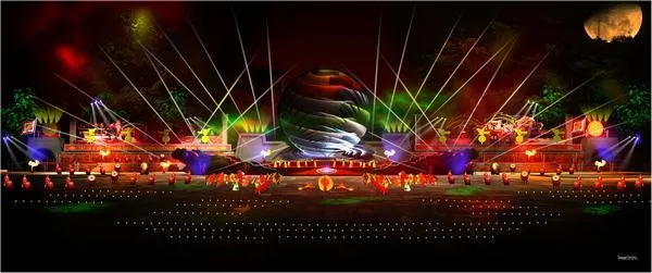Tổng thể không gian sân khấu là sự kết hợp giữa mỹ thuật sắp đặt tĩnh và động với kỹ thuật hiện đại. Một mặt trống đồng lớn đường kính 15m được thiết kế giữa trung tâm sân khấu tôn vinh thần trống đồng (hiện đang được thờ ở đền Đồng Cổ, núi Khả Phong, huyện Yên Định, Thanh Hóa. Là ngôi đền được đánh giá là lâu đời nhất xứ Thanh).