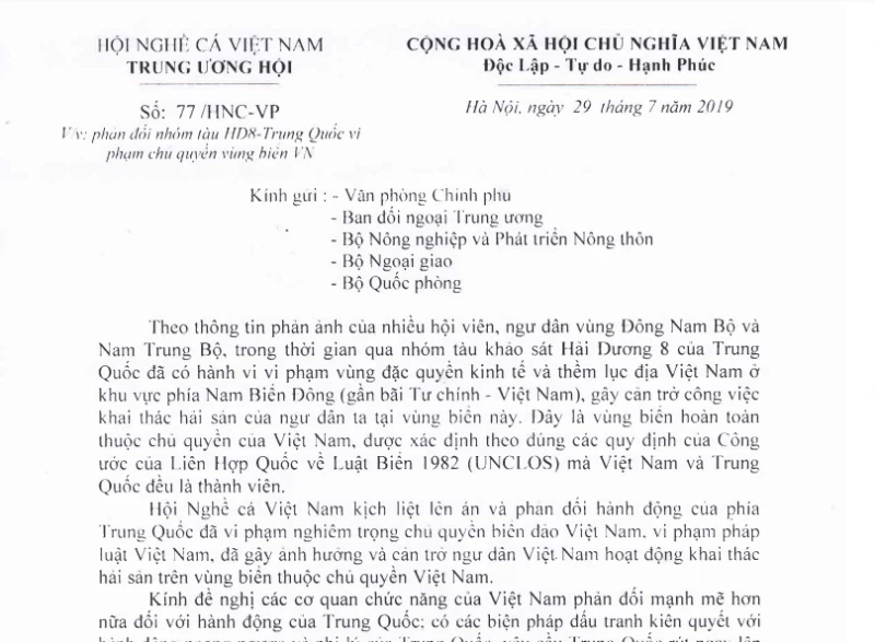 Trung ương Hội Nghề cá Việt Nam vừa có văn bản gửi Văn phòng Chính phủ, Ban Đối ngoại Trung ương, Bộ NN&PTNT, Bộ Ngoại giao, Bộ Quốc phòng để phản đối việc nhóm tàu HD8-Trung Quốc vi phạm chủ quyền vùng biển Việt Nam.