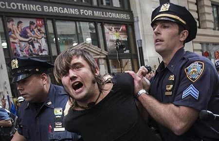Cảnh sát bắt giữ người biểu tình phản đối các công ty gây thương tổn môi trường ở phố Wall Street tại New York (Mỹ) ngày 22-9. Ảnh: REUTERS