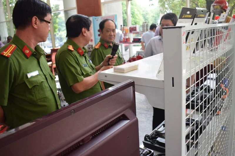 Khách mời tham quan các thiết bị PCCC của Trung tâm thiết bị PCCC 4/10 trưng bày ở sảnh. Ảnh: NGUYỄN TRÀ