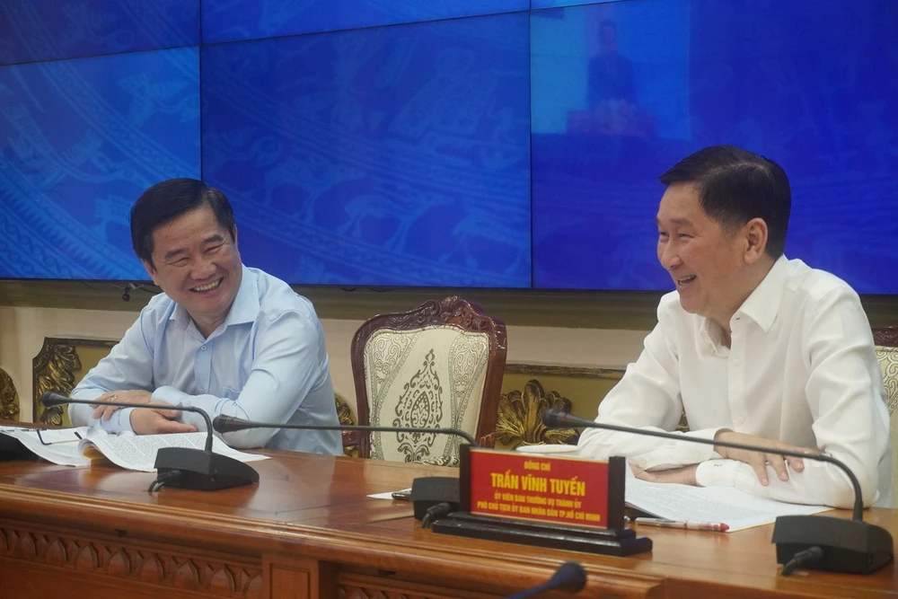 Phó Chủ tịch UBND TP.HCM Trần Vĩnh Tuyến (phải) và Giám đốc Sở Tư pháp TP.HCM Huỳnh Văn Hạnh đồng chủ trì hội nghị tại điểm cầu TP.HCM. Ảnh: MINH TÂM