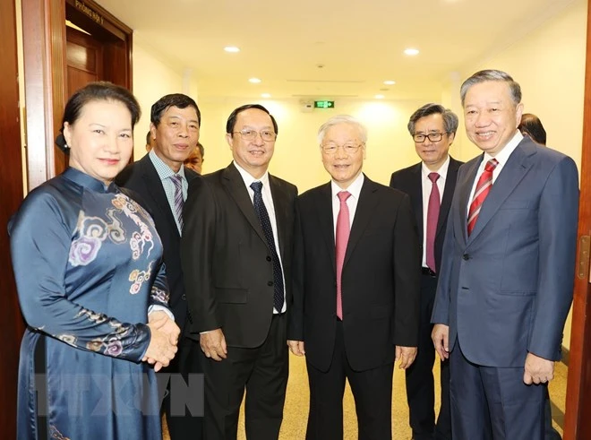 Tổng bí thư - Chủ tịch nước Nguyễn Phú Trọng chụp ảnh chung với các cán bộ cao cấp của Đảng trước phiên khai mạc Hội nghị Trung ương 13. Ảnh: TTXVN.