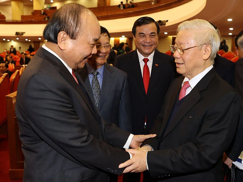 Tổng bí thư, Chủ tịch nước Nguyễn Phú Trọng và Thủ tướng Nguyễn Xuân Phúc tại phiên bế mạc Hội nghị Trung ương 14, khóa XII. Ảnh: TTXVN