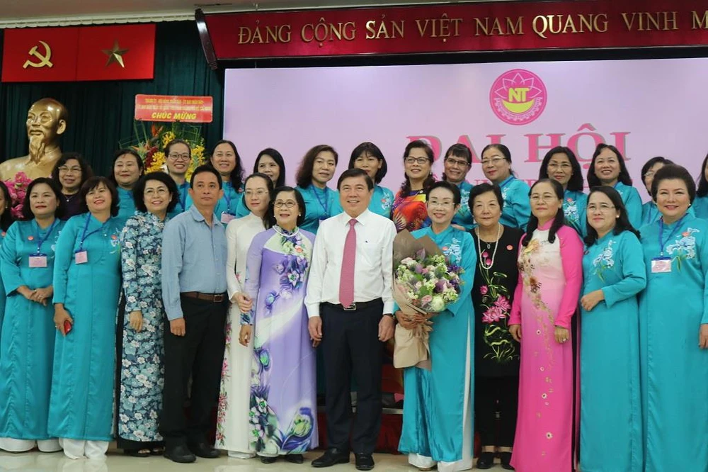 Chủ tịch UBND TP.HCM, ông Nguyễn Thành Phong, chụp ảnh lưu niệm cùng Ban chấp hành và đại biểu Hội Nữ trí thức TP.HCM. Ảnh: THỦY TRÚC