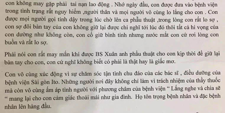 Thư của bệnh nhân Thảo gửi các bác sĩ của bệnh viện, nơi cứu chữa bàn tay cho mình