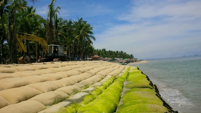 Chính quyền Hội An phải khắc phục tạm thời bằng việc xúc cát bỏ vào từng bao tải để làm kè mềm nhưng vẫn chưa thể giải quyết được vấn đề. LÊ PHI