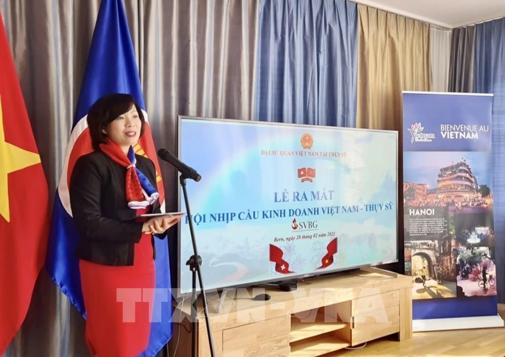 Đại sứ Việt Nam tại Thụy Sĩ - bà Lê Linh Lan tại Lễ ra mắt Nhịp cầu kinh doanh Việt Nam-Thụy Sĩ (SVBG). Ảnh: TTXVN