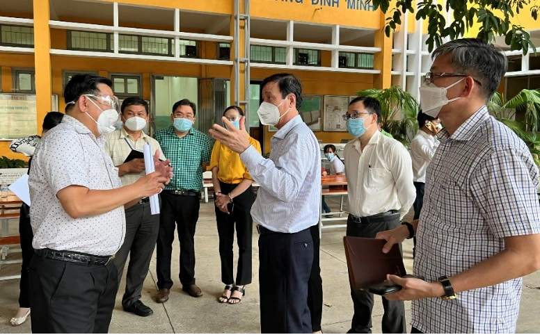 Đại diện Sở Y tế cùng Sở GD&ĐT TP kiểm tra một điểm tiêm vaccine ngừa COVID-19 cho trẻ. Ảnh: HCDC