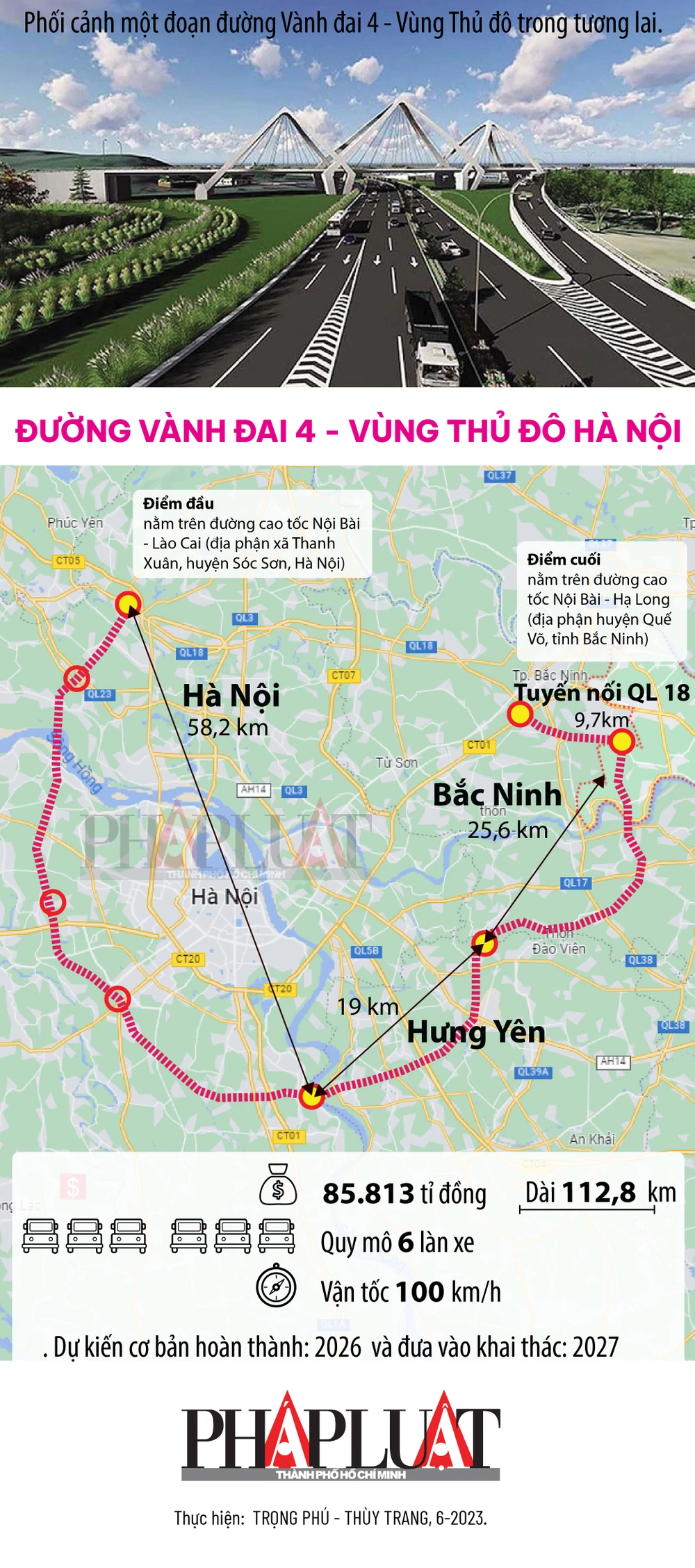 (PLO)-  Dự án vành đai 4 - vùng thủ đô Hà Nội đi qua địa phận ba tỉnh, thành phố gồm Hà Nội, Hưng Yên và Bắc Ninh với tổng mức đầu tư dự kiến 85.813 tỉ đồng.