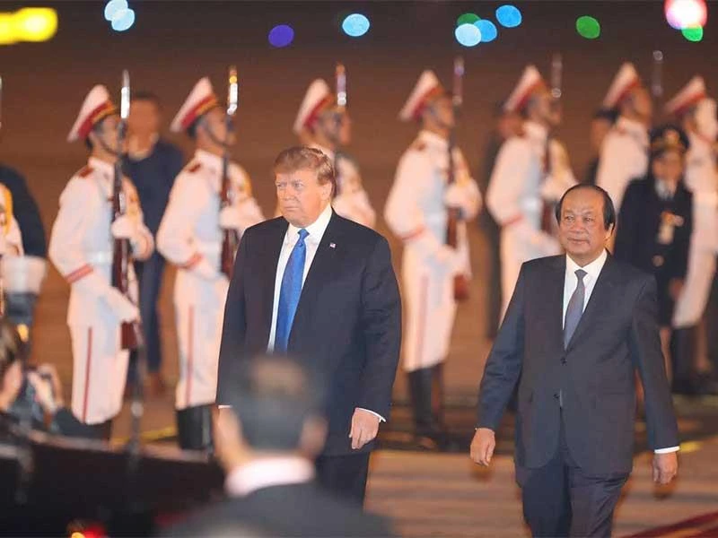 Tại Nội Bài, tổng thống Mỹ bước ra cửa máy bay và vẫy chào mọi người một cách thân thiện. Bộ trưởng, Chủ nhiệm Văn phòng Chính phủ Mai Tiến Dũng cùng đoàn đại biểu Việt Nam đã đón tiếp tổng thống Mỹ. Sau phần đón tiếp tại sân bay, chiếc Cadillac (được mệnh danh là “quái thú”) với sự hộ tống của lực lượng an ninh đã đưa ông Trump về khách sạn Marriott. Trên đường từ Nội Bài về khách sạn, đông đảo người dân đã xếp hàng hai bên đón chào ông Donald Trump trong lần quay trở lại Việt Nam này.