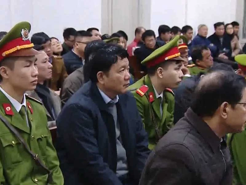 Ông Đinh La Thăng (ngồi giữa) tại phiên xử vụ cố ý làm trái… xảy ra tại PVN và PVC hồi tháng 1-2018. Ảnh: Đ.MINH