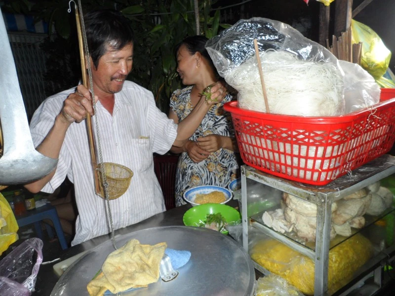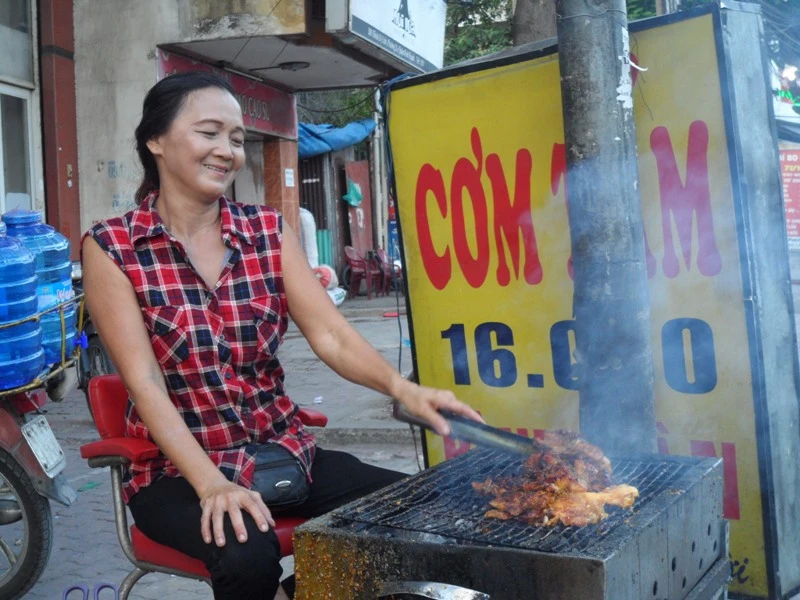 Cả gia đình cô Lê Thị Hiệp làm nghề bán cơm tấm trên đường Đinh Bộ Lĩnh đã hơn 10 năm nay. Ở đây, chỉ có cơm gà giá 20.000 đồng, các món còn lại đồng giá 16.000 đồng, cô bán rẻ nên quán rất đông khách. Nhanh tay dùng chiếc kẹp lật lại miếng thịt nướng, cô bảo bình thường cô bán đến đêm khuya mới nghỉ nhưng hôm nay thì phải cố gắng bán hàng nhanh hơn để còn cùng cả nhà đi xem bắn pháo hoa.