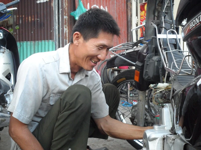 Cách quán cô Hiệp không xa là quán sửa xe nho nhỏ của anh Ba. Anh Ba là người Sài Gòn làm nghề sửa chữa xe đạp, xe máy trên đường Đinh Bộ Lĩnh (Bình Thạnh) đã hơn 20 năm nay. Anh Ba bảo ngày cuối cùng của năm với anh cũng như mọi ngày, vẫn làm việc đến tối về đưa tiền cho vợ là đi ngủ.