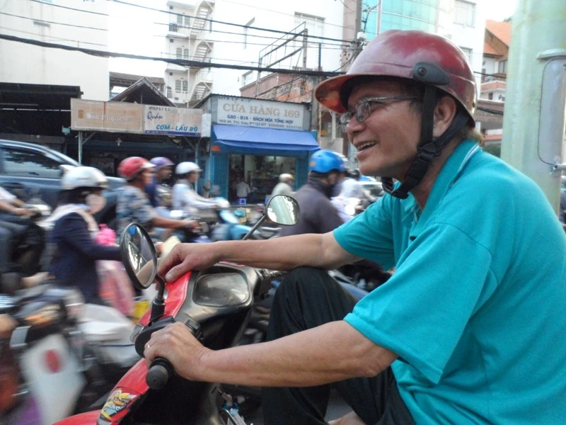 Trong lúc chờ đợi, tôi tấp xe lên vỉa hè con đường Võ Thị Sáu, quận 3 và dừng lại bắt chuyện với một người lái xe ôm tóc đã điểm bạc. Ông là Ninh Văn Thường Lạc, năm nay ông 61 tuổi. Ông bảo nhà ông không có con, chỉ có hai vợ chồng, vợ ông buôn bán nhỏ. Tiền dành dụm mà hai ông bà làm được thời trẻ cũng phần nào giúp hai người sống an nhàn tuổi già. Nhưng sợ “nhàn cư vi bất thiện”, tuổi này ông vẫn thích chạy xe vừa kiếm tiền vừa khuây khỏa.