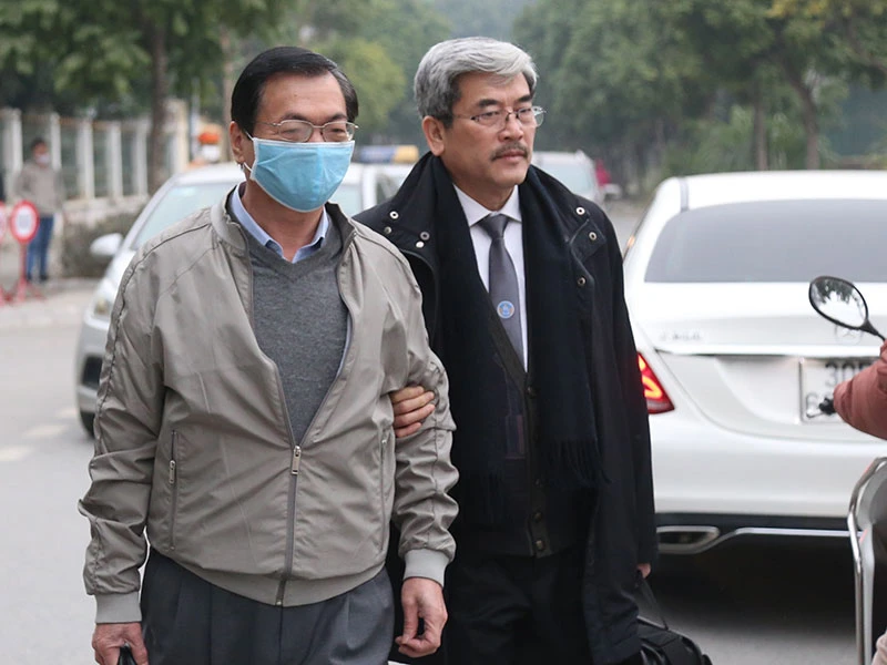 Cựu bộ trưởng Vũ Huy Hoàng cùng luật sư đến TAND TP Hà Nội trong phiên xử bị hoãn trước đó. Ảnh: TP