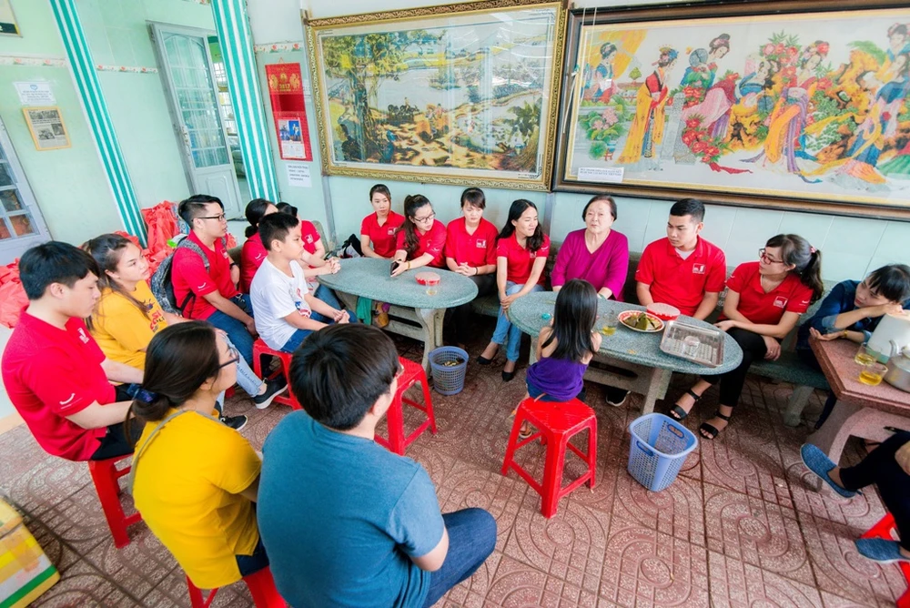 Tập thể nhân viên Home Credit trò chuyện cùng má Mười - người thành lập Mái ấm Thiện Duyên.