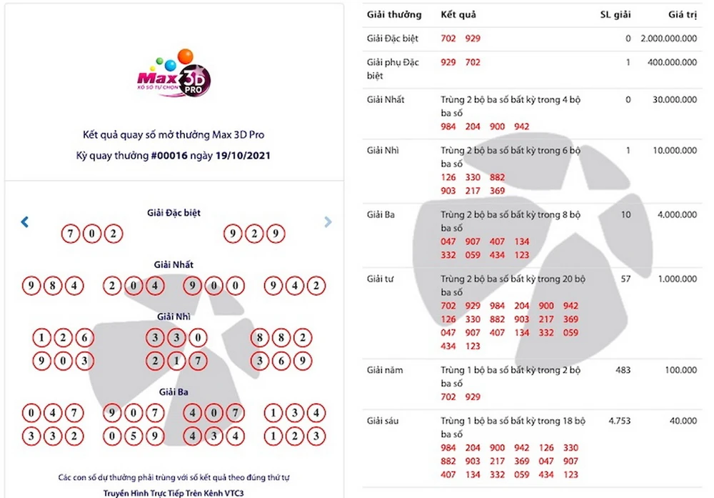 Mới đây nhất, tại kỳ quay #00016 (mở thưởng tối 19/10), một thuê bao MobiFone đã trúng giải Phụ Đặc biệt trị giá 400 triệu đồng, chưa tính các giải khác kèm theo. Vé dự thưởng chứa 3 bộ số Cơ bản được mua với giá 30.000 đồng, trong đó bộ số 702 929 (đảo so với bộ số 929 702 của giải Đặc biệt) mang tới cho người chơi giải thưởng giá trị nói trên.