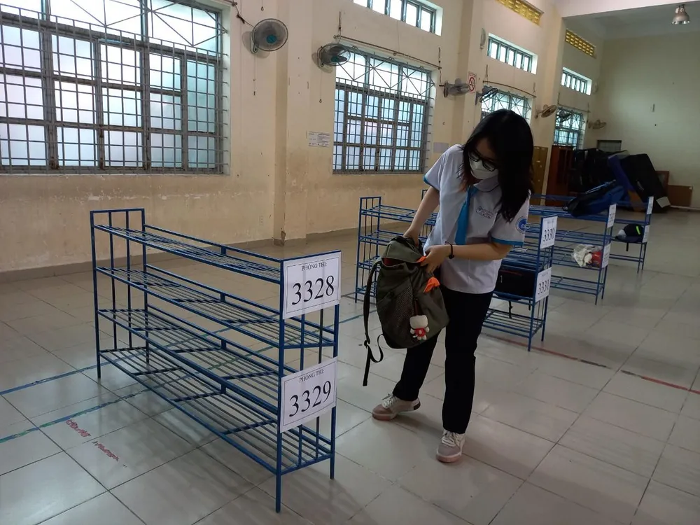 Tại TP.HCM, ở điểm thi Trường THPT Hiệp Bình, TP Thủ Đức, nhiều thí sinh đã có mặt rất sớm để đến phòng thi chờ tới giờ vào làm thủ tục. Năm nay, điểm thi này có 600 em đến từ 10 cụm trường khác nhau trong địa bàn. Thực hiện theo chỉ đạo mới của Bộ GD&ĐT về phòng chống gian lận bằng công nghệ trong thi cử, điểm thi đã bố trí khu vực để đồ dùng cá nhân cho thí sinh rất rộng rãi và cách xa hơn 25 mét so với quy định. Tại đây, thí sinh được hướng dẫn để đồ dùng theo phòng thi và có hai nhân viên giám sát.