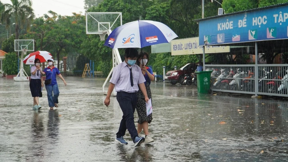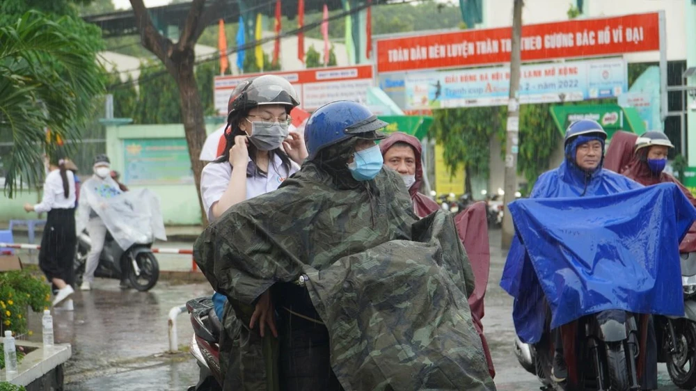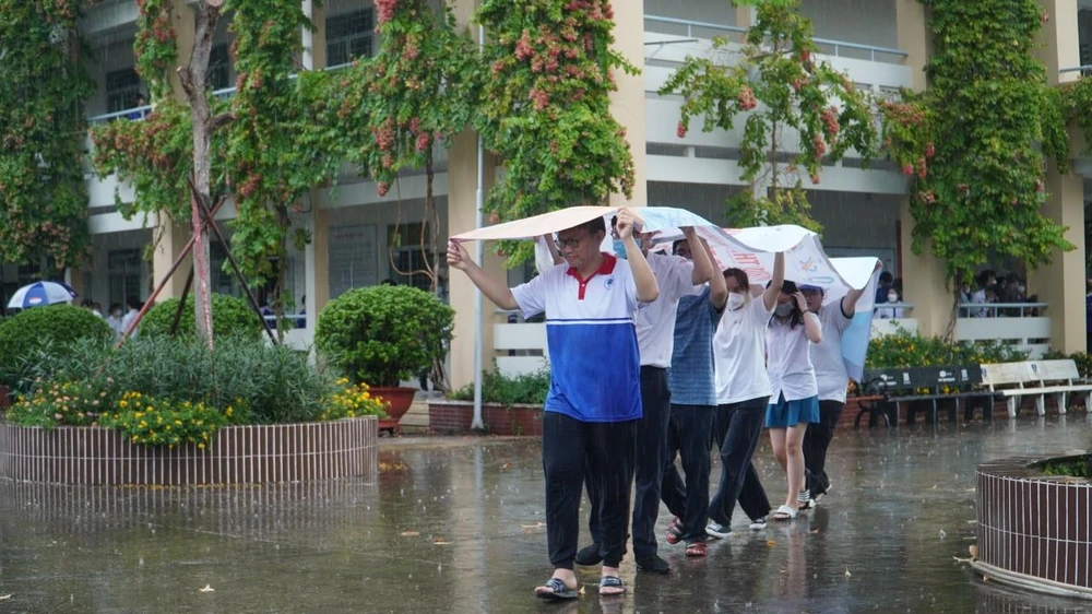Sau thời gian làm thủ tục thi, một số khu vực tại TP.HCM trời đổ mưa lớn, lực lượng sinh viên tình nguyện nhanh chóng hỗ trợ thí sinh: