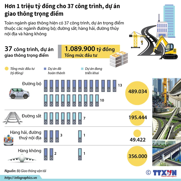 Toàn ngành giao thông hiện có 37 công trình, dự án trọng điểm thuộc các ngành đường bộ; đường sắt; hàng hải, đường thủy nội địa và hàng không.