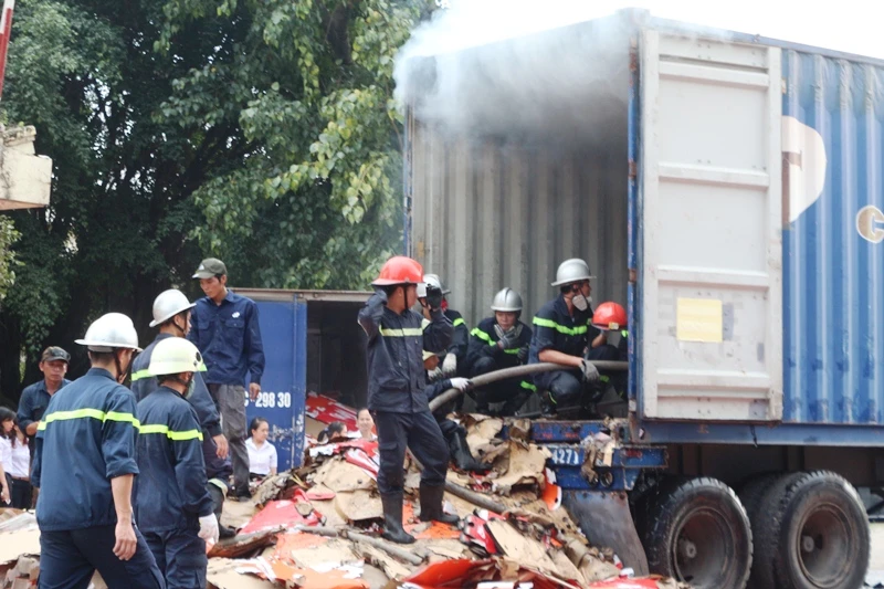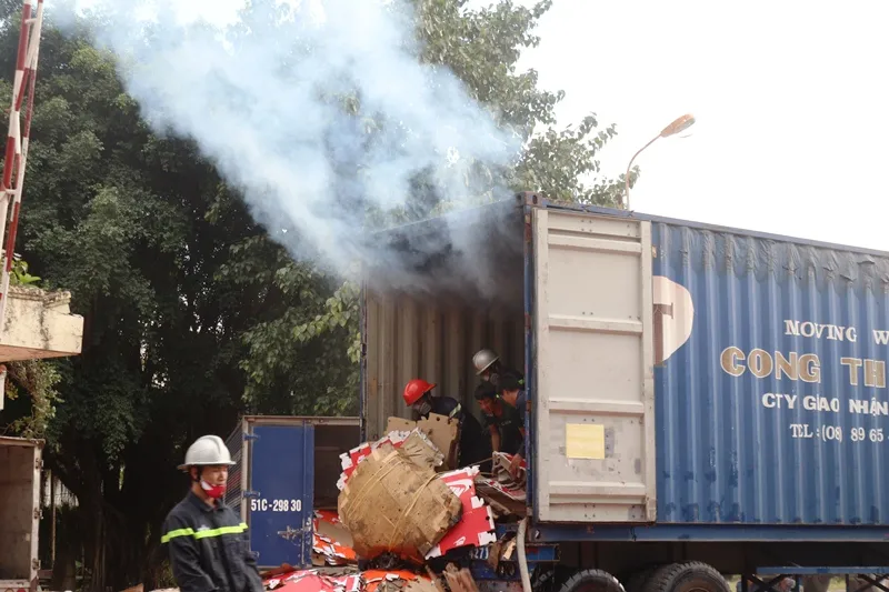Tại hiện trường, phần thùng container khoảng 40 feet, sức chứa khoảng 28 tấn bị hư hỏng; theo thông tin ban đầu, khói và lửa đã lan khoảng 1/3 thùng container làm một khối lượng lớn giấy cháy thành tro.