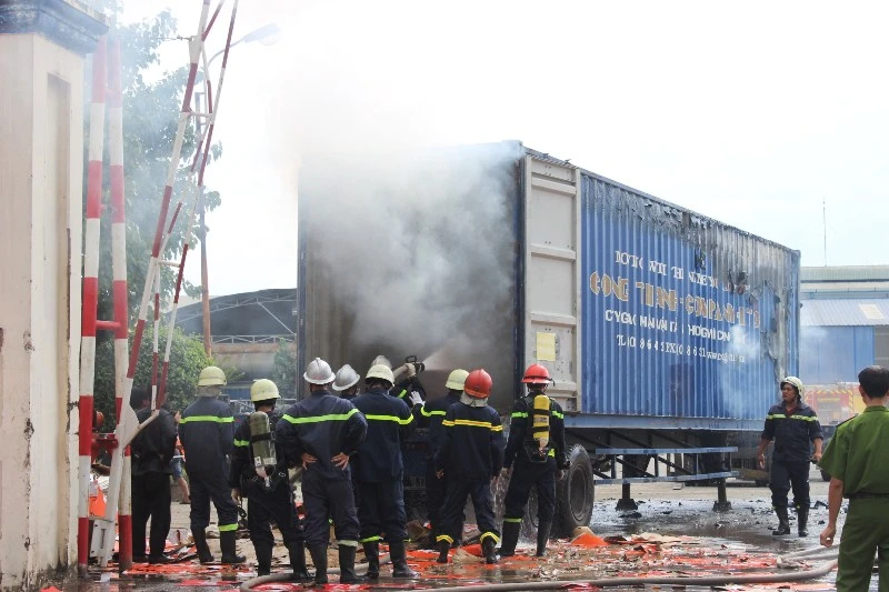 Nhận thông tin, lực lượng PCCC quận 9 và Khu chế xuất Linh Trung đã có mặt với nhiều xe chuyên dụng phối hợp lực lượng sở tại phục vụ chữa cháy, nhiều chiến sĩ đã mang mặt nạ phòng độc vào sâu trong thùng xe container để xịt nước dập lửa.