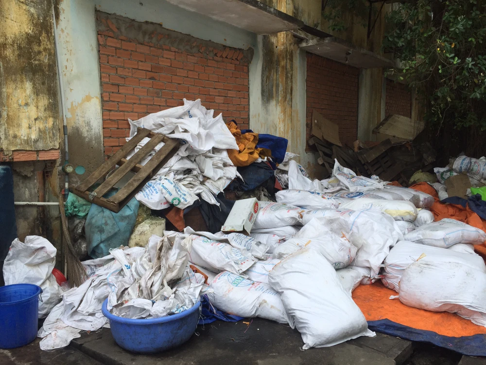 Những bao tải mứt 50 kg chất đống ngoài cửa kho hàng