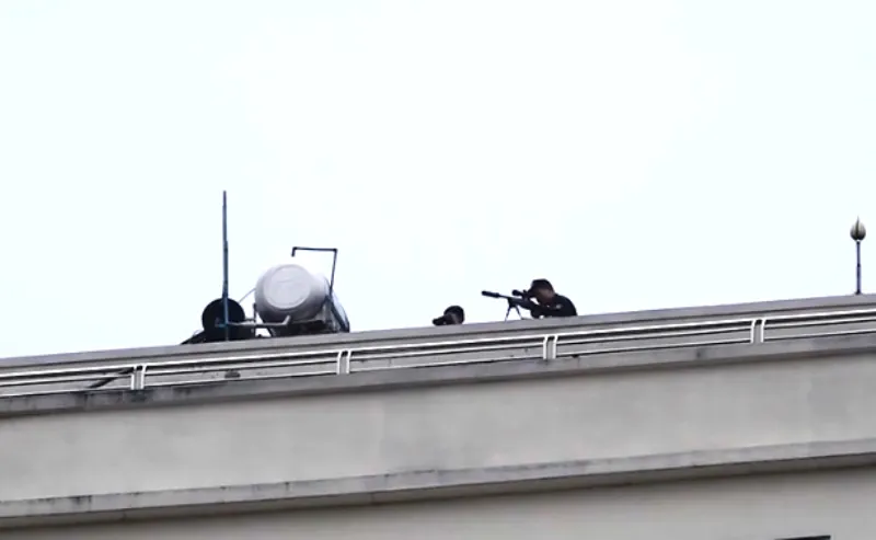 Nhiều cảnh sát đặc nhiệm đã ôm súng ở trên các mái nhà cao tầng, dõi mắt xuống hiện trường.