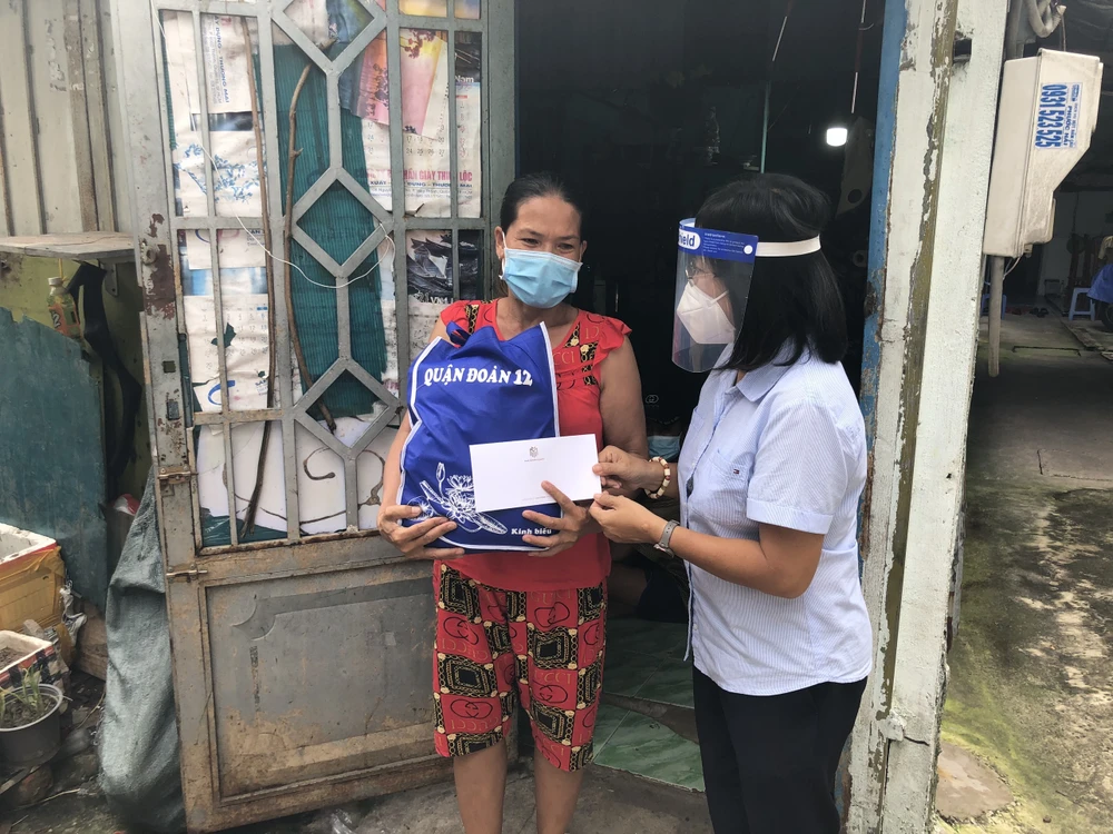 Cán bộ Đoàn đại diện chương trình “Giữ tổ ấm giữa đại dịch” gửi tặng quà hỗ trợ tới tay người lao động.