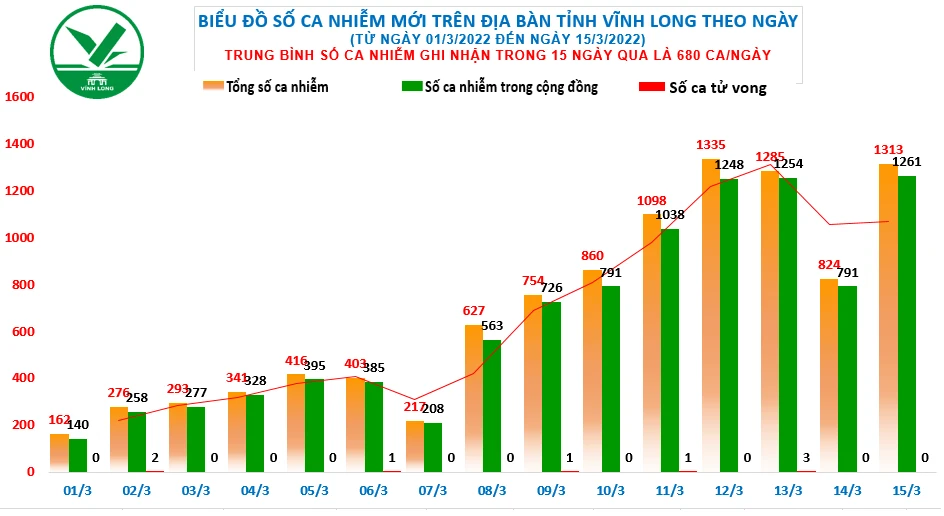 Trong ngày 15-3, Vĩnh Long ghi nhận tổng cộng 1.313 trường hợp nghi nhiễm COVID-19, trong đó có 673 trường hợp qua xét nghiệm cộng đồng. Như vậy từ đầu năm đến nay Vĩnh Long đã ghi nhận 23.733 ca nhiễm, trong đó tử vong 437 người.