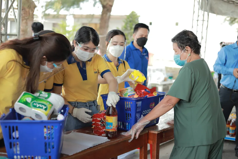 Lực lượng tình nguyện viên hỗ trợ bà con mua sắm tại Siêu thị mini Tết 0 đồng.