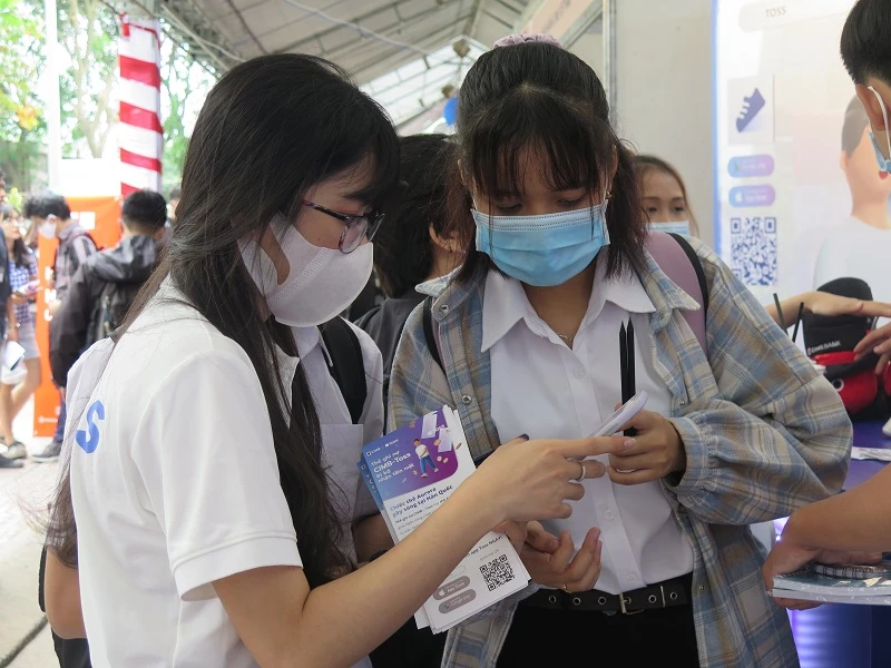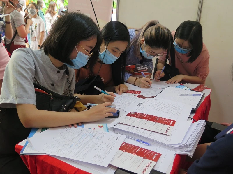 Sinh viên đăng ký việc làm tại các gian hàng của doanh nghiệp. Ảnh: PA