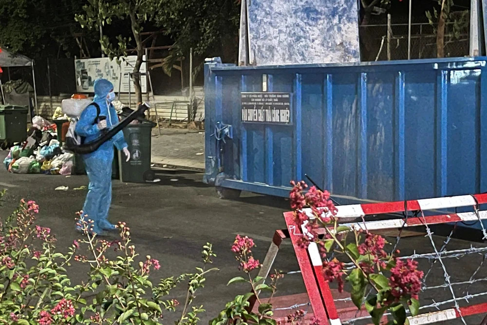 Trước khi dỡ bỏ phong tỏa, lực lượng y tế phun thuốc khử khuẩn để đảm bảo an toàn. Ảnh: KD