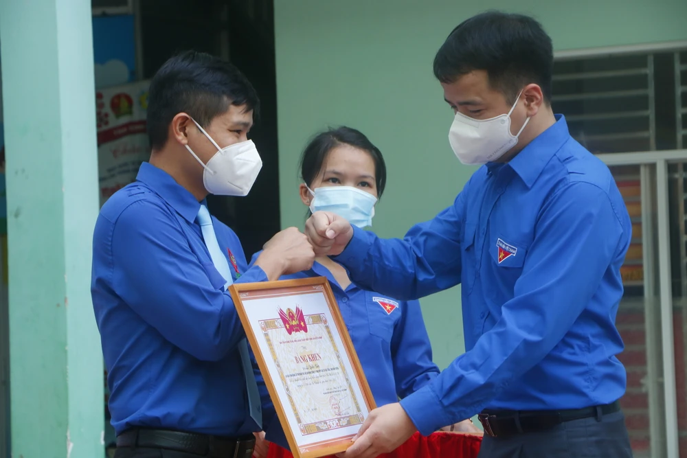 Đại diện Trung ương Đoàn TNCS Hồ Chí Minh tặng bằng kheo cho các tập thể, cá nhân có thành tích xuất sắc qua sơ kết 5 năm thực hiện Chỉ thị 05-CT/TW của Bộ Chính trị. Ảnh: LÊ ÁNH