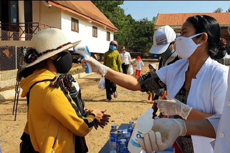 Người dân được đo thân nhiệt trước khi vào nhận gạo.